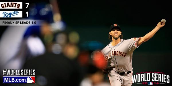 Los Gigantes de San Francisco, campeones de la Liga Nacional, impusieron condiciones durante el primer juego de la Serie Mundial de Beisbol al vencer este martes por 7-1 a los Reales de Kansas City, campeones de la Liga Americana, en el estadio Kauffman, en Missouri.